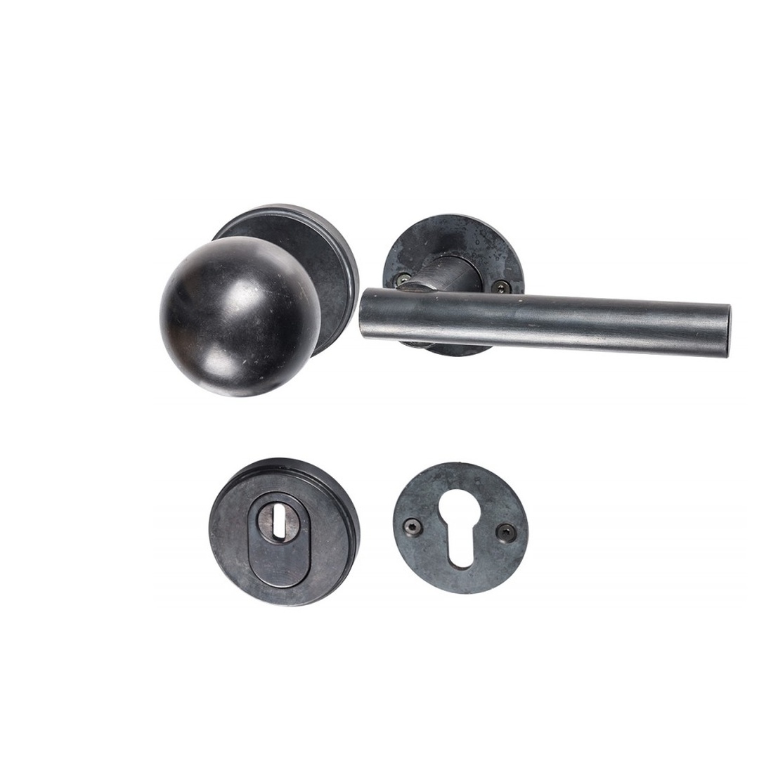 HALCÖ Sicherheitswechselgarnitur in schwarzSTAHL in dieser unverwechselbaren rustikalen Oberfläche mit dem „nie gleichen“ Finish. Für den Einsatz im Außenbereich (z.B. Hauseingang) haben wir eine spezielle witterungsbeständige Oberfläche entwickelt: schmiedeEISEN verzinkt schwarz patiniert. Diese kombinieren wir dann im Innenbereich mit schwarzSTAHL. Bitte wählen Sie im Pulldown-Menü ihre entsprechende Variante. Abgebildet ist die Garnitur komplett in schwarzSTAHL. Die Durchgangsbohrungen sindd bei 38 mm nach DIN. Wir liefern die Garnitur komplett mit feststehendem Kugelknopf außen mit Kernziehschutzrosette und Innen mit dem Drücker FÜGEN. Als Drücker / Drückergarnitur (beidseitig drehbare Klinke) wäre das preisgleich genauso wie die Variante außen mit drehbarem Knopf. Bitte unter Bemerkungen angeben. Der Drücker ist links / rechts verwendbar. Die Befestigungsmaterialien sind für eine Türstärke von 76 mm beigelegt. Der Vierkant wie auch die Schrauben sind kürzbar. inkl. MwSt, zzgl. Versandkosten Versandkostenfrei in folgende Länder: Mehr anzeigen Weniger anzeigen