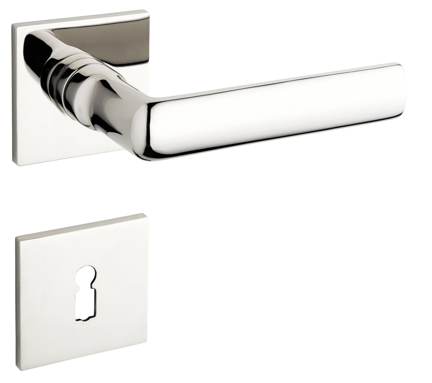 BAUHAUS Rosettengarnitur im Design nach Hans Poelzig (1869 bis 1936)- Hans Poelzig wurde 1929 die Ehrendoktorwürde an der technischen Hochschule Stuttgart verliehen, daher haben wir das Kürzel POE 29 gewählt. Das Photo zeigt die Nickel polierte Variante mit sichtbar verschraubten quadratischen Rosetten 52 x 52 x 5 mm Bitte wählen Sie im pulldownmenu Ihre gewünschte Kombination aus Oberfläche und Schlüssel- oder WC/Bad-Rosetten. Oder auch ganz ohne Schlüsselrosetten NSB. Die gewünschte Anzahl Ihrer Garnituren können Sie im Warenkorb einstellen. Lieferumfang: 1 Paar Drücker, 1 Paar sichtbar verschraubte Drückerrosetten sowie 1 Paar Buntbart BB-, oder Profilzylinder PZ- oder WC/Bad Rosetten, komplett mit 8 x 8 mm Vierkant für TS 38 – 45 mm, Durchgangsschrauben und Linsen-Senkkopf-Holzschrauben mit Schlitz und 1 Sechskantschlüssel. inkl. MwSt, zzgl. Versandkosten Versandkostenfrei in folgende Länder: Mehr anzeigen Weniger anzeigen